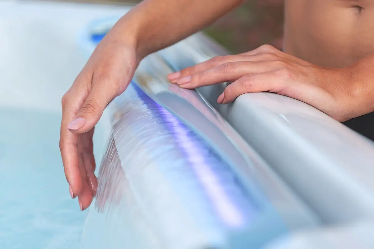 The LightSide™ cabinet system appears in PeakLife spas, which include concealed lighting beneath the corner elements, and an in-house-developed LED strip running along the spa’s side cover.